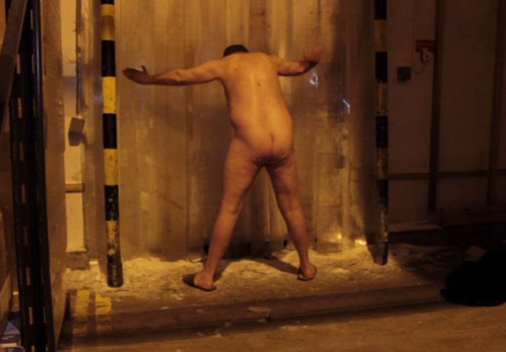 As part of my investigation, I went to a freezer warehouse in North London to experience it myself. I stripped off and stood in the Amerikanka stress torture position, described by the opposition, for as long as I could bear. Opposition activists say they had to endure 40 minutes. I lasted 40 seconds.