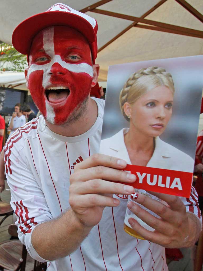 Mr Yanukovych is carrying on as if nothing has happened. He was at Ukraine's first game in Kiev, when the national team beat Sweden 2-1, and was pictured wildly celebrating Ukraine's goals. Aides say he will also be in Donetsk to watch Ukraine take on England tonight. Ms Tymoshenko issued a statement yesterday calling on Ukrainians to come together and support the national team against Roy Hodgson's side.