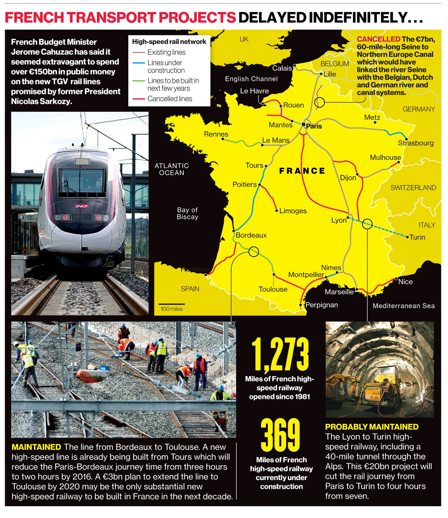 Pharaonic but unfunded Euros 250bn transport scheme promised by the former President Nicolas Sarkozy, including other high speed railway lines and a deep-water canal linking Paris to the North Sea, can simply not be built in the present economic climate, the government has concluded.