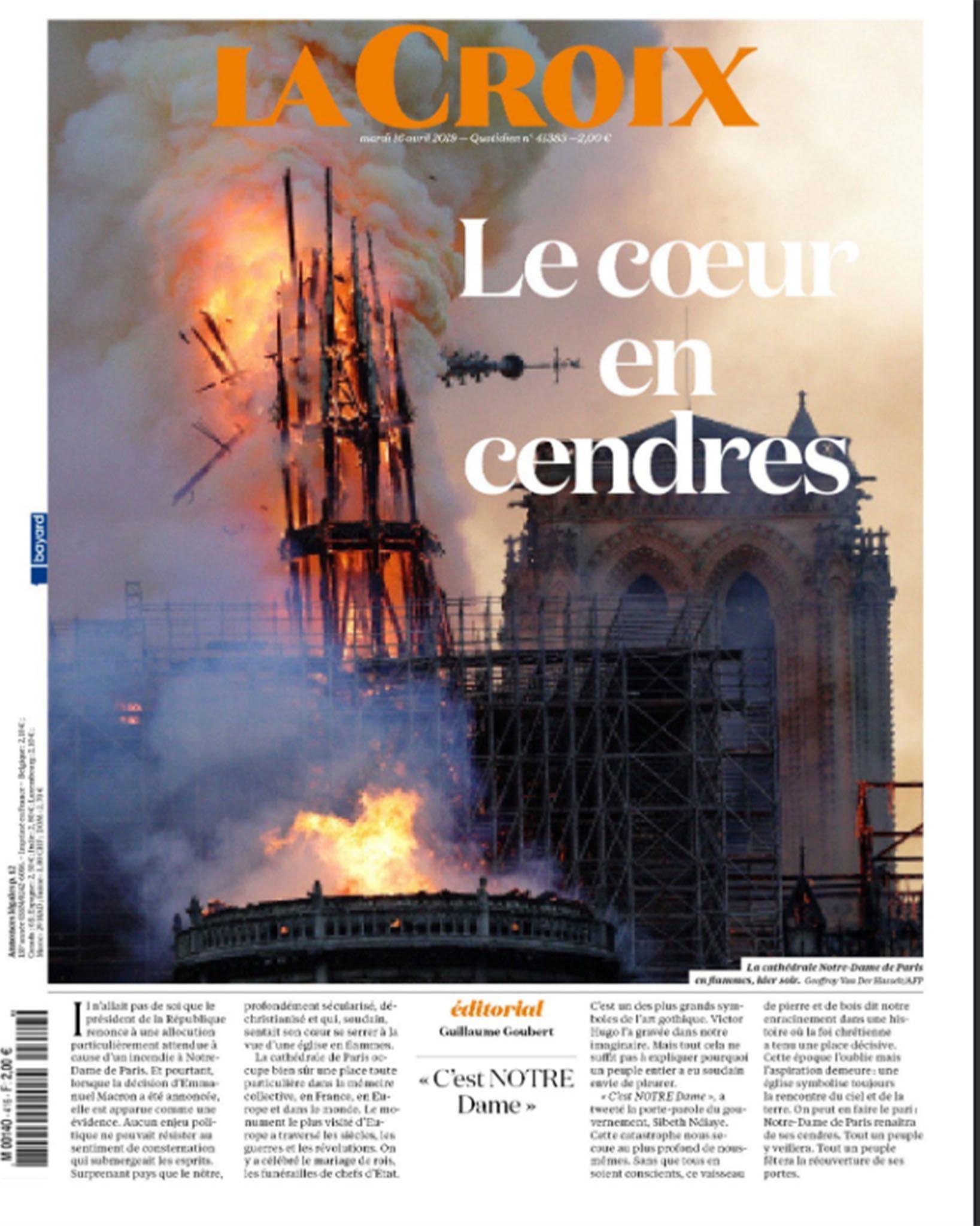 French Roman catholic newspaper La Croix calls the fire "Le coeur en cendres", meaning 'our heart in ashes'.