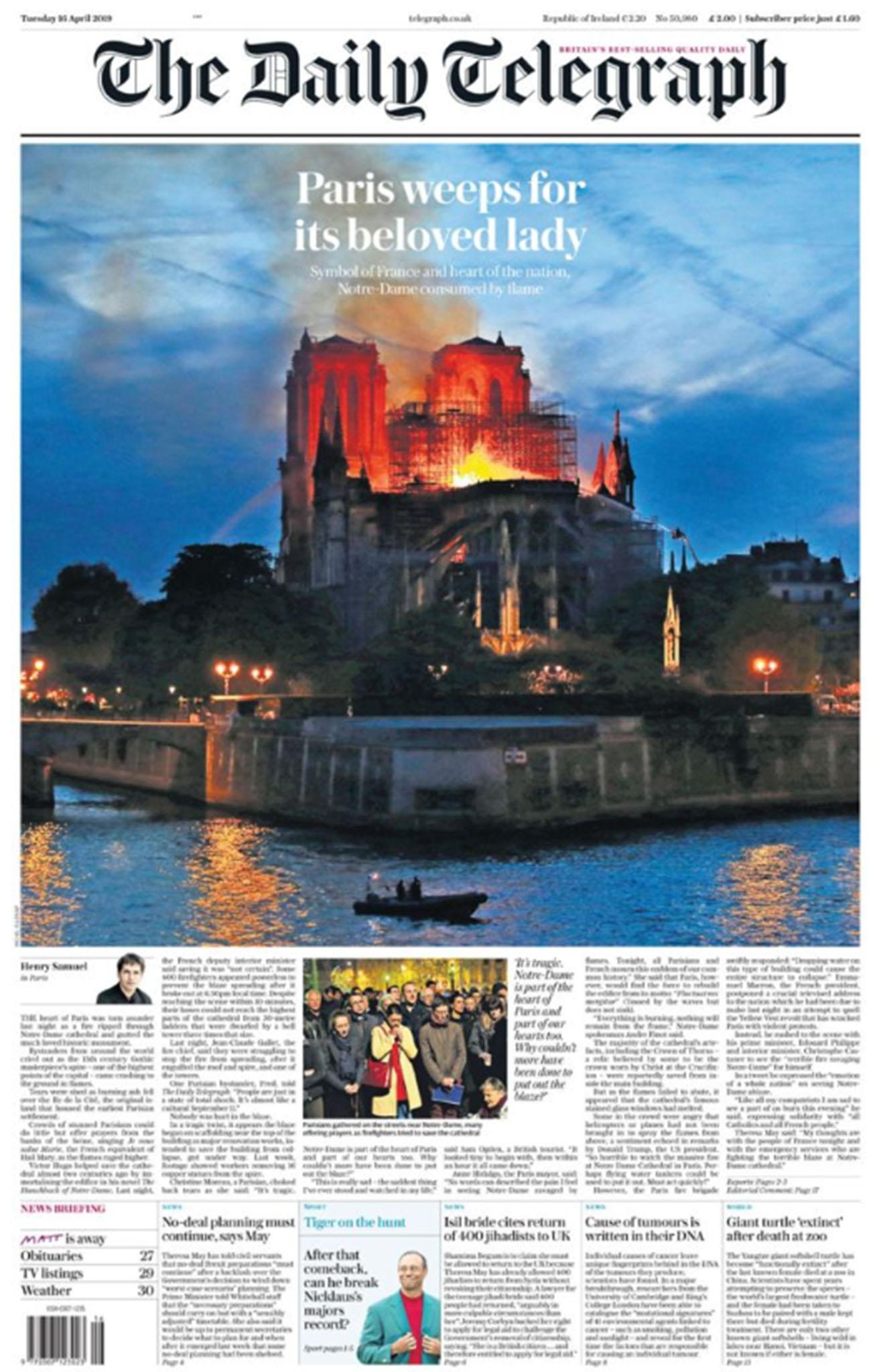 In Britain, papers focus of the "tragedy" (I), the "centuries of histories lost" (Daily Mail) and "the battle to save Notre Dame" (The Times).