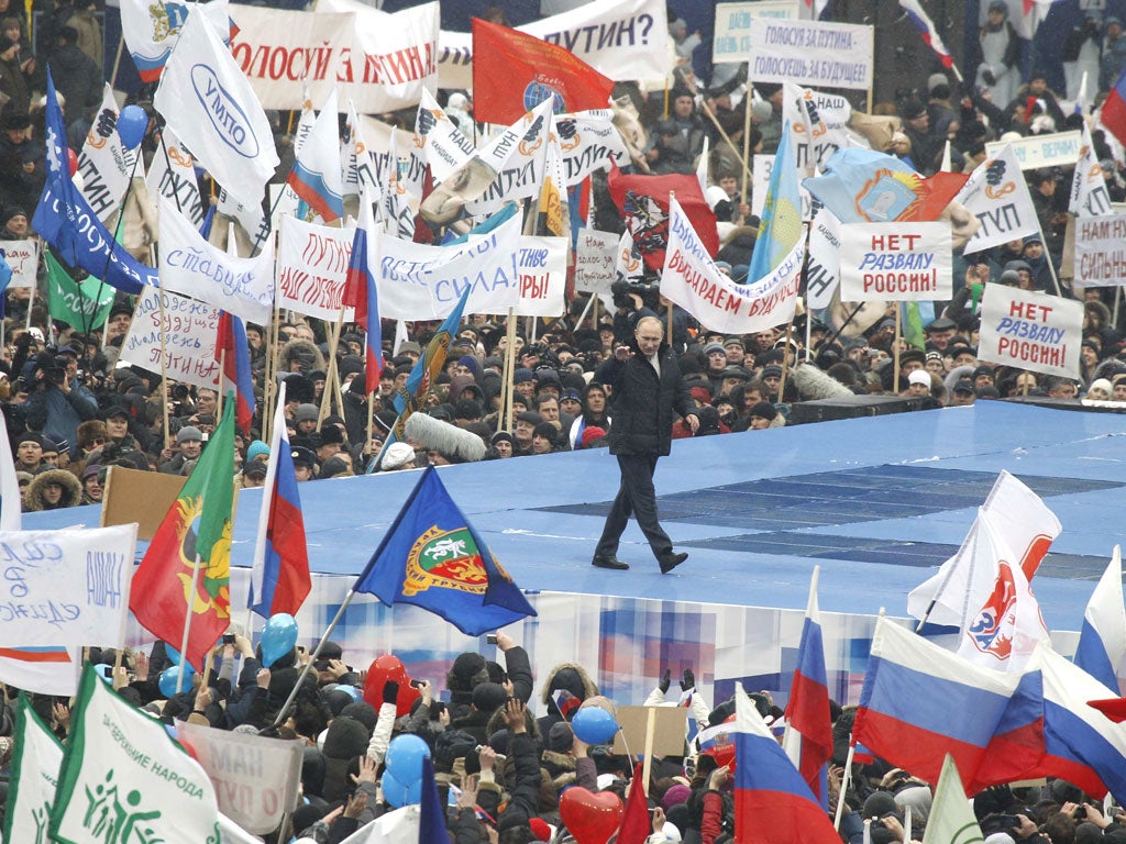 "We're here to say that we love Russia, and say it so that the whole country hears us!" As snow fell from a slate-grey sky Mr Putin, who has been Prime Minister for the past four years but now wants to return to the presidency, insisted that he was the only man who could guarantee Russia stability and see off threats from nefarious foreign powers. "We ask everyone not to look abroad, not to run to the other side and not to betray your motherland," said Mr Putin. "We won't allow anyone to meddle in our affairs or impose their will upon us, because we have a will of our own."