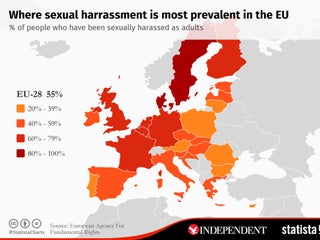 A chart compiled by Statista for The Independent shows the percentage of people who said they experienced sexual harassment as adults in the EU’s member states.