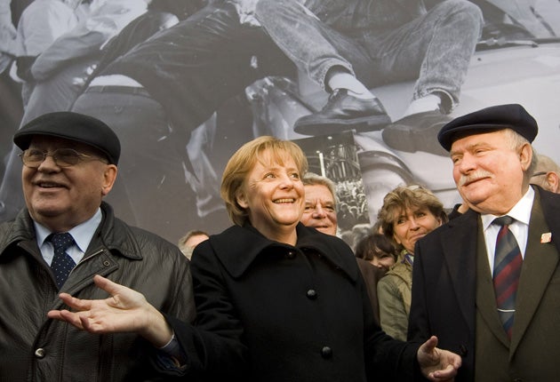 Lech Walesa, still every inch the Polish shop steward in his unionist's cap, Mikhail Gorbachev, still recognisably the Russian Communist he was then, and Angela Merkel, who when the Wall fell was a humble scientist in East Berlin.