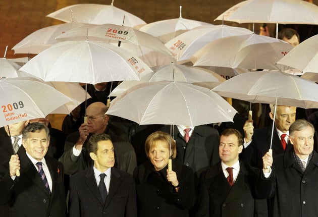 Last night it was still raining as all 27 EU leaders plus Hillary Clinton and President Dmitry Medvedev of Russia gathered under the Brandenburg Gate. Also attending was the former Hungarian prime minister Miklos Nemeth, whose decision to open his country's borders with the West in the summer of 1989 was a key step towards Communism's collapse.
