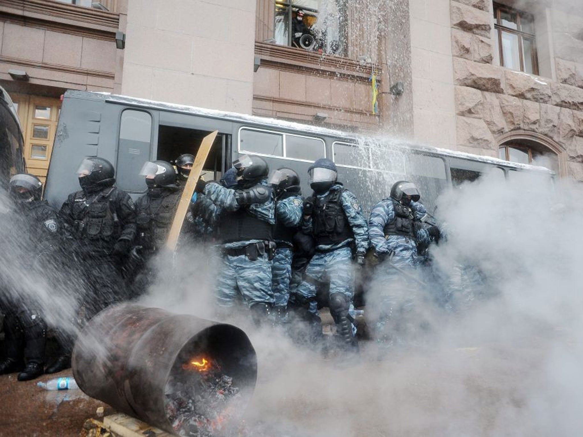 Violent clashes have erupted in Ukraine as riot police attempted to storm the occupied Kiev City Hall.