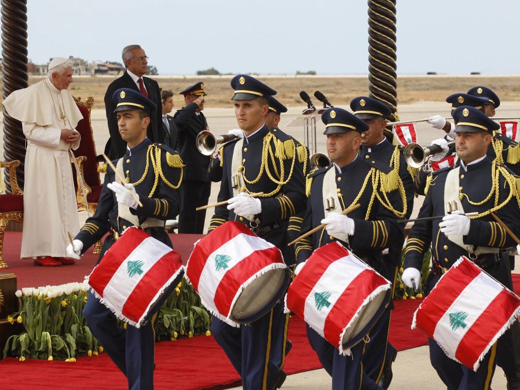 Pope Benedict XVI appealed for a halt to arms imports to Syria yesterday ahead of landing in Beirut for a three-day visit focused on promoting peace in the Middle East.