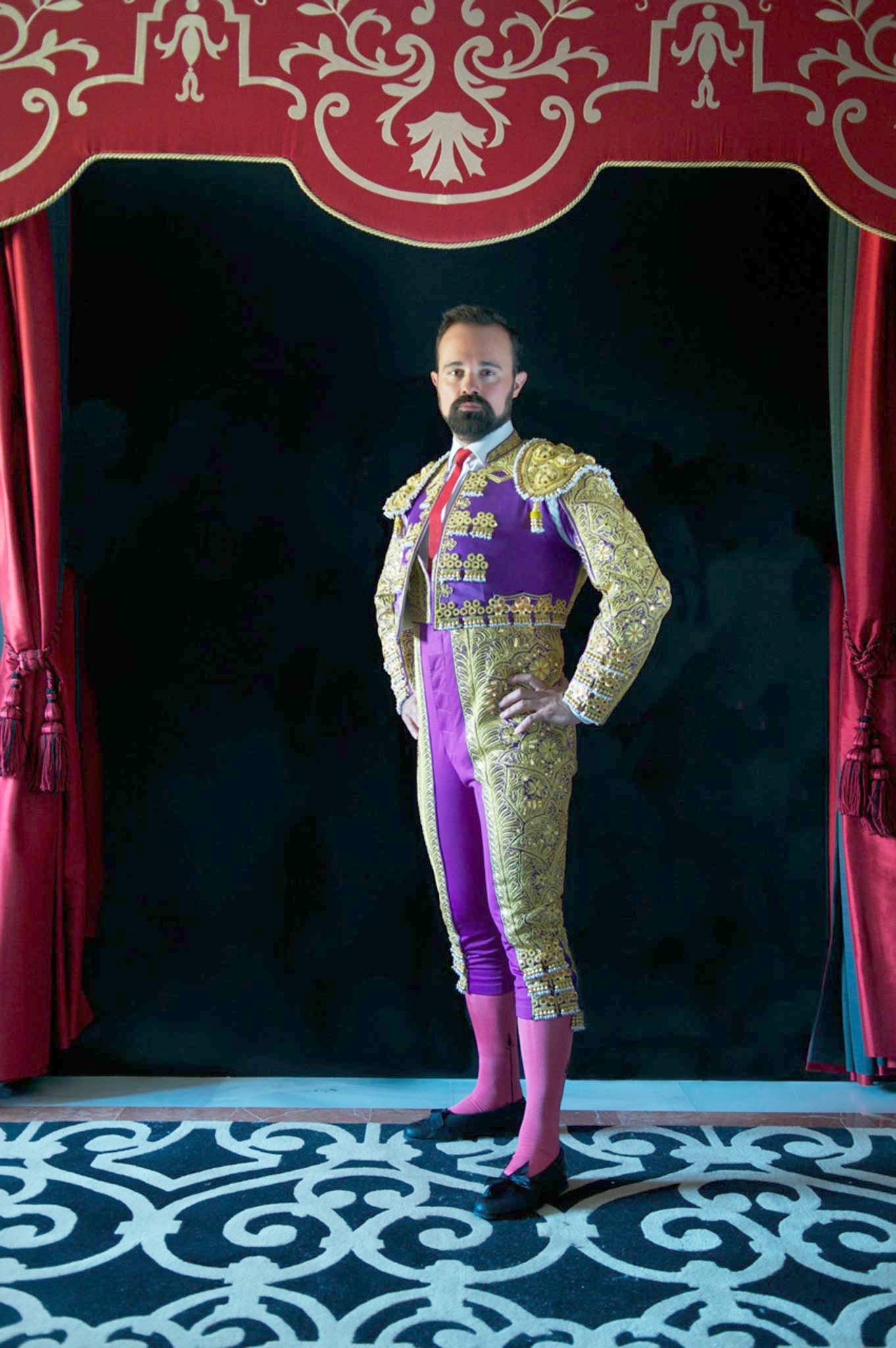 His dresser was fitting him into the traditional satin suit of the torero, its pink cloth emblazoned with sequins and gold thread. He was already in his embroidered white shirt and short, black necktie. Now he was being squeezed into his trousers, the material skin-tight so no sag of material risked catching a passing horn. To do this, Padilla had to be physically lifted off the ground – sweat patches spread across his dresser's shirt as he made his efforts.