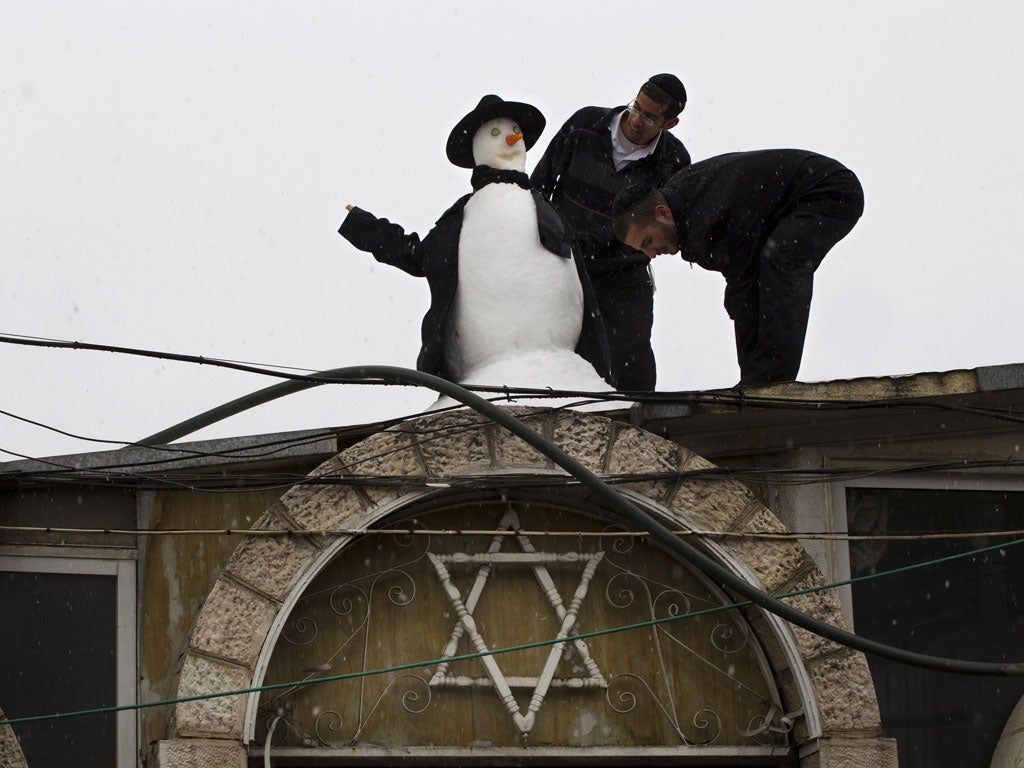 Residents and tourists ventured out to the unusual winter weather in the Holy Land and schools were closed for the day. About 3cm of snow fell overnight on Thursday and at least 10cm is forecast.