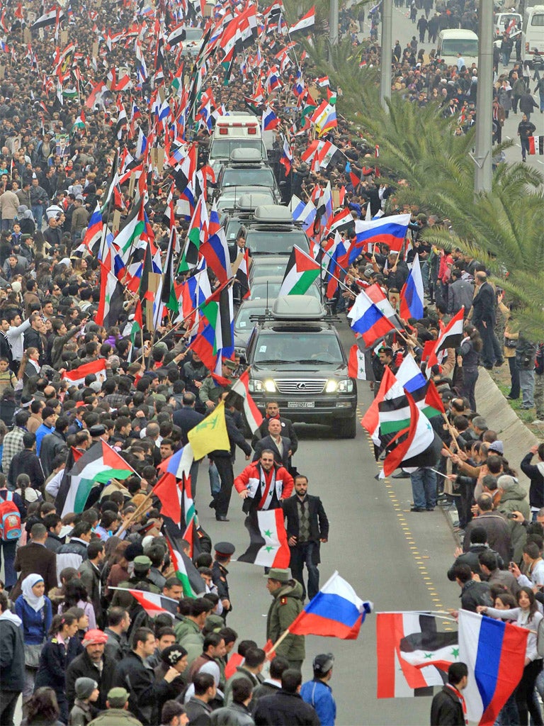 Earlier, Mr Lavrov received a rapturous welcome in Damascus, with crowds packing the roads along his route from the airport. Buses filled with chanting Assad supporters sped past with Syrian flags flying from the windows. "We love President Bashar al-Assad – do you love President Assad?" asked a beaming girl of about 12, as she browsed a street stall of regime paraphernalia for another trinket to match her Assad baseball cap, football scarf, T-shirt and badge.