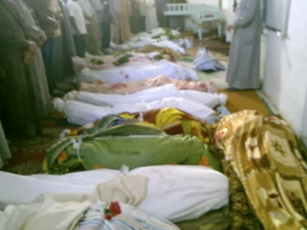 Crammed into the Tremseh village mosque, women and children wailed prayers over row after row of corpses yesterday before the bodies were carried outside, packed into mass graves and buried. Overwhelmed by the scale of the slaughter, the tiny village about 25km outside the city of Hama had run out of traditional white burial shrouds, instead using curtains and tablecloths to wrap the dead.
