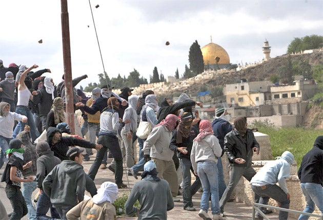Police said 60 Palestinians were arrested in rioting, which had been encouraged by Hamas's call for a "day of rage" in protest at Monday's re-dedication of a synagogue in the Old City's Jewish Quarter. Hamas claimed that this move endangers the Al Aqsa Mosque 400m away. Police said the injured policemen were mainly hit by stones, but one was shot in the hand last night.