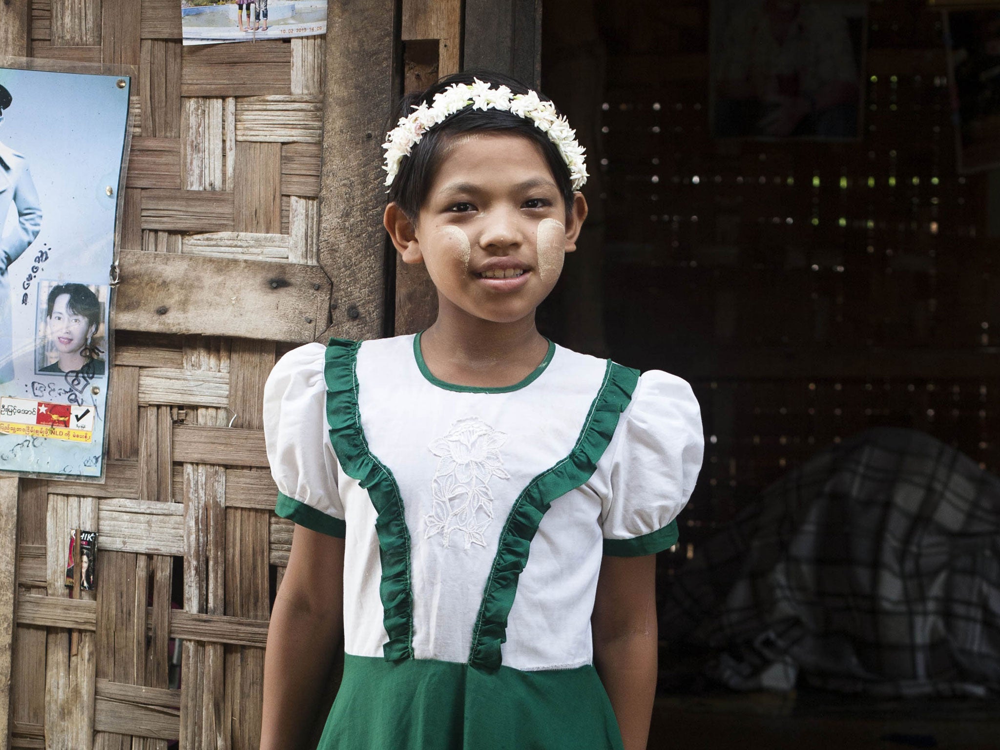 May Myat Naing, from Myaing town, Myanmar, lives with her older sister and her mum, in a bamboo hut with a palm leaf roof. Her father died seven years ago, leaving her mother to fend for the family. Her four brothers work in Thailand and China, sending money back to support the family. Naing wakes up at 5.30am every day to deliver her mother’s fried vegetables to local villagers; the family earns 68p a day through this business. Naing hopes to be a school teacher when she grows up.