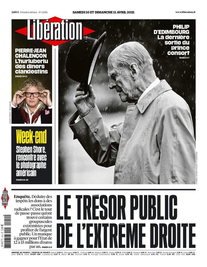 Libération, the French newspaper, featured an image of Philip prominently on its over. The black-and-white photograph shows the duke in profile, taking off his bowler hat.