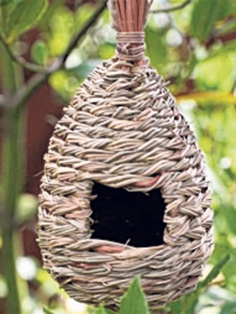 A little nest, for little birds to brave the winter in. Made of a twisted rattan that allows for ventilation, but nicely stays the wind.