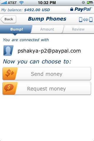 With Bump integrated into the application, PayPal customers can wirelessly transfer contact information (like the email address needed to send or receive money transfers with PayPal) from one device to another by bumping the phones together.