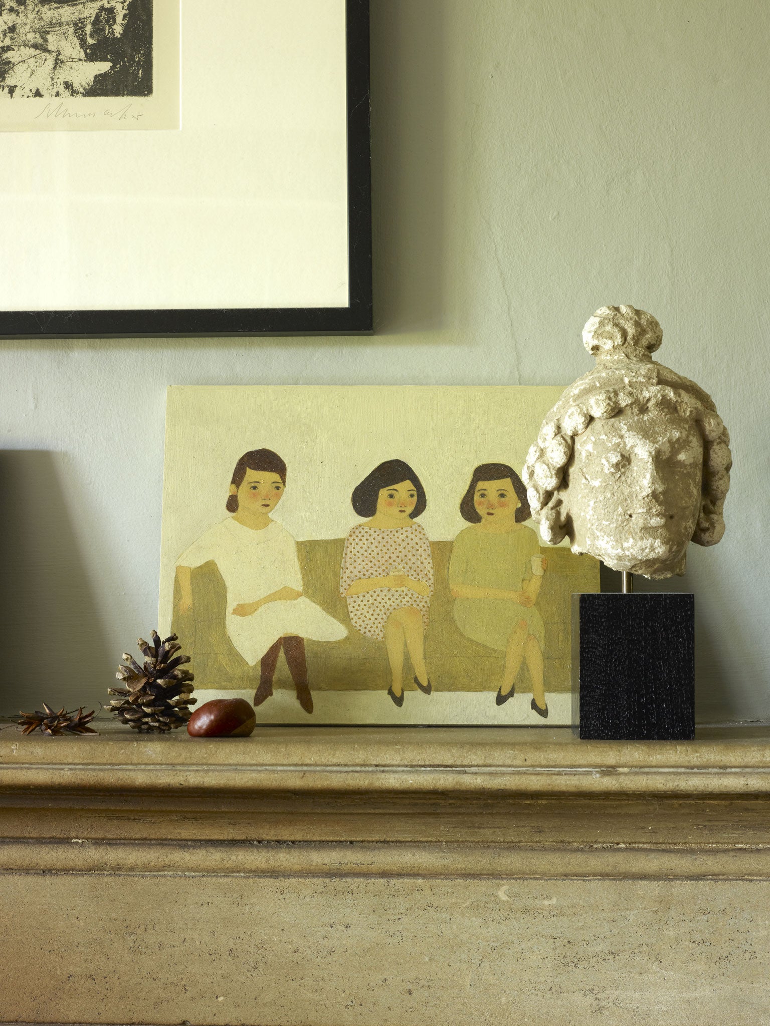 Many of the pieces were inherited or donated by friends and family when they moved in. Their favourite is the Shadey Family light that hangs above the living-room table, an early piece by lighting designer Stuart Haygarth. They also treasure the facet-framed mirror by the artist Sam Orlando Miller above the living-room fireplace and artworks by the highly collectable painter Prunella Clough.