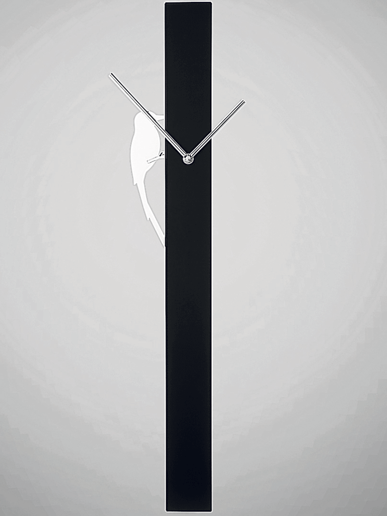 A dainty little bird sits on the side of this open-faced black bar clock, as if it is has paused for a momentary sing-song.
