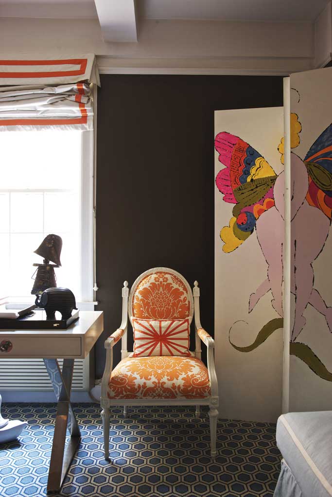 While there are zig-zags and spirals in zingy blue on his carpets, and a spread of pink paisley for a ping-pong table top, his New York home really reveals an enduring love for eye-popping citric orange and green: "Those are perennial favourites," he concedes. "Orange is the colour of sun and happiness; lime-green is an instant palate cleanser."