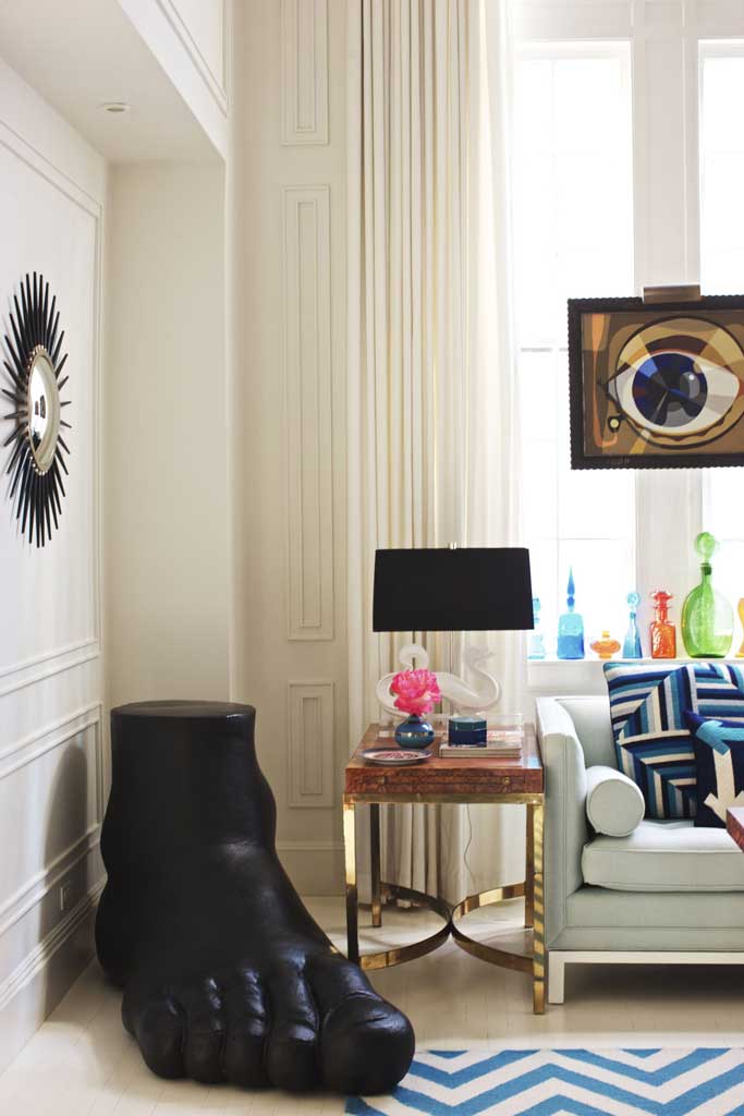 That huge black foot, which looks as though it's stomped down from an episode of Monty Python's Flying Circus, is a key piece for Adler, too. It's a remake of a work by Gaetano Pesce, the New York designer-cum-architect. "It's always a good idea to play with scale, and surrealism," suggests Adler. "It's great to have a big statement and I think that scale is one of the best tools in any designer's arsenal."