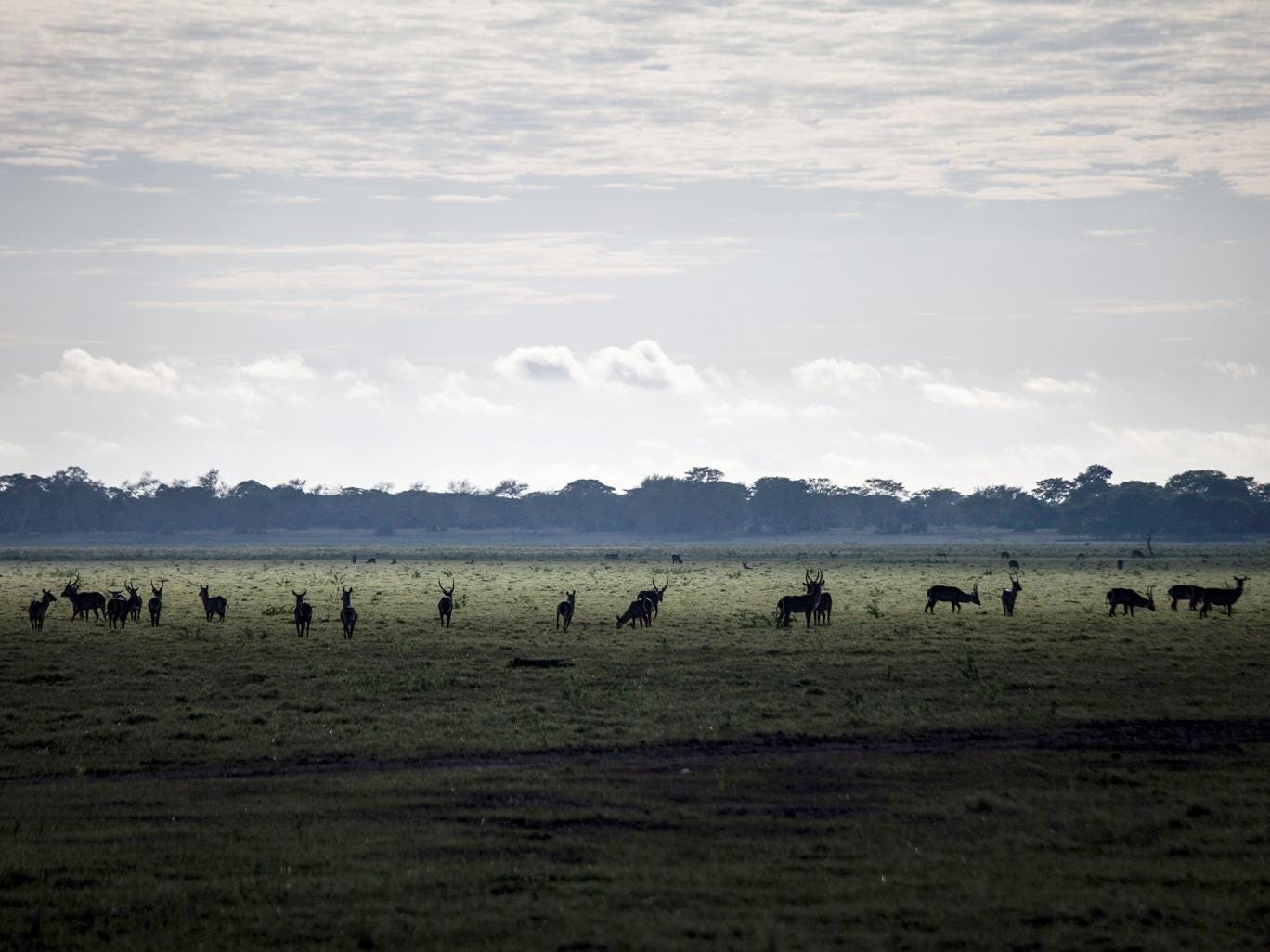 We come across a herd during an afternoon drive. The park’s vegetation is thick and lush from April’s unexpectedly heavy rainfall (the wet season is from mid-December to March, during which time the park is closed) and we find the elephants feeding a short distance from the road. They permit us to watch for a few minutes, before there’s a low grumble followed by a tremendous, fierce trumpeting. Castro Maquina, our guide from nearby Vila Gorongosa, is used to this behaviour and starts the engine. The elephants spread out in a line alongside and behind us. As we drive, they run cumbersomely in single file alongside the vehicle, ushering us away. After a short distance keeping pace with us, the elephants come to a halt, eyeballing us, ears fanned out: their message is clear, and we move on. It’s just a warning.