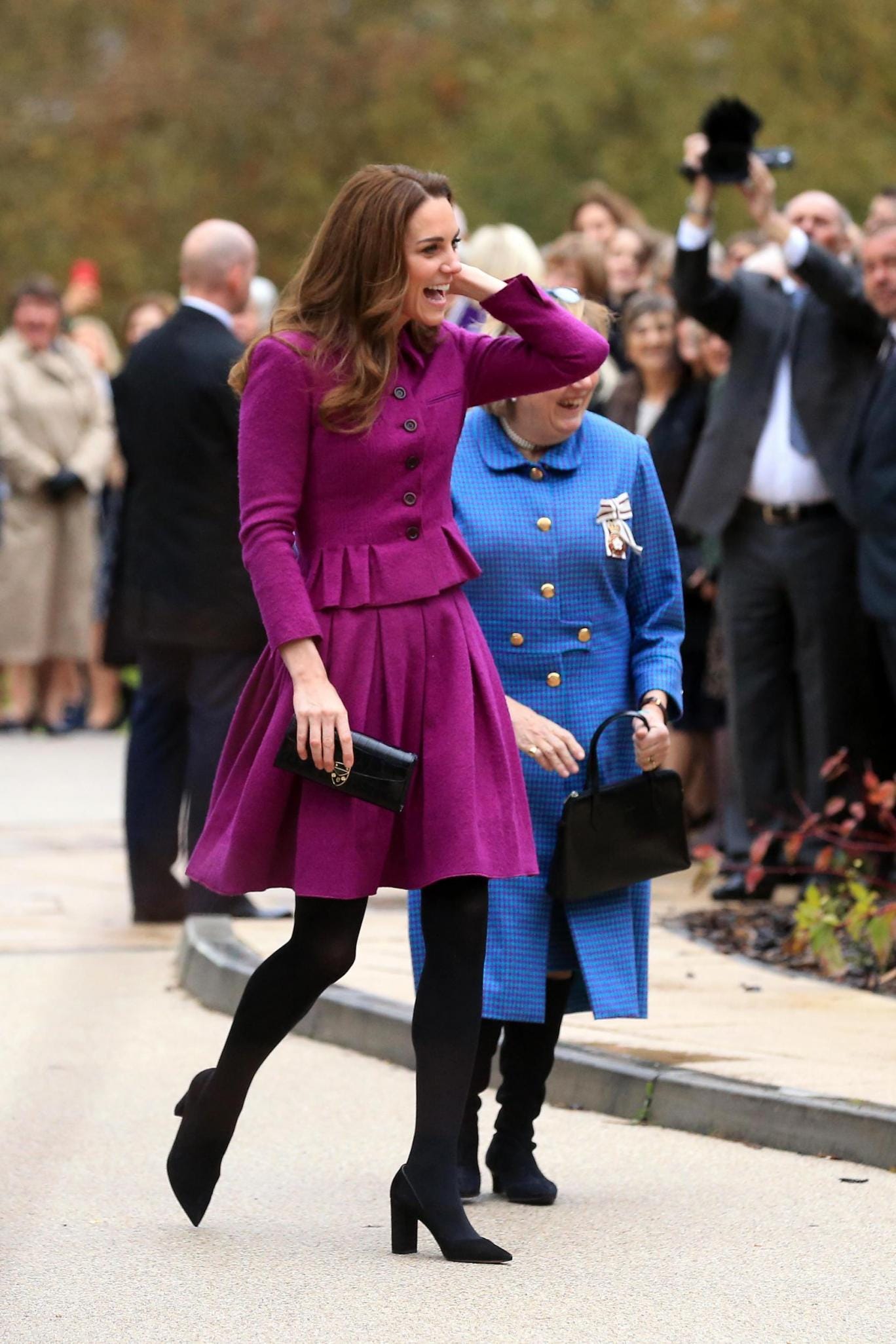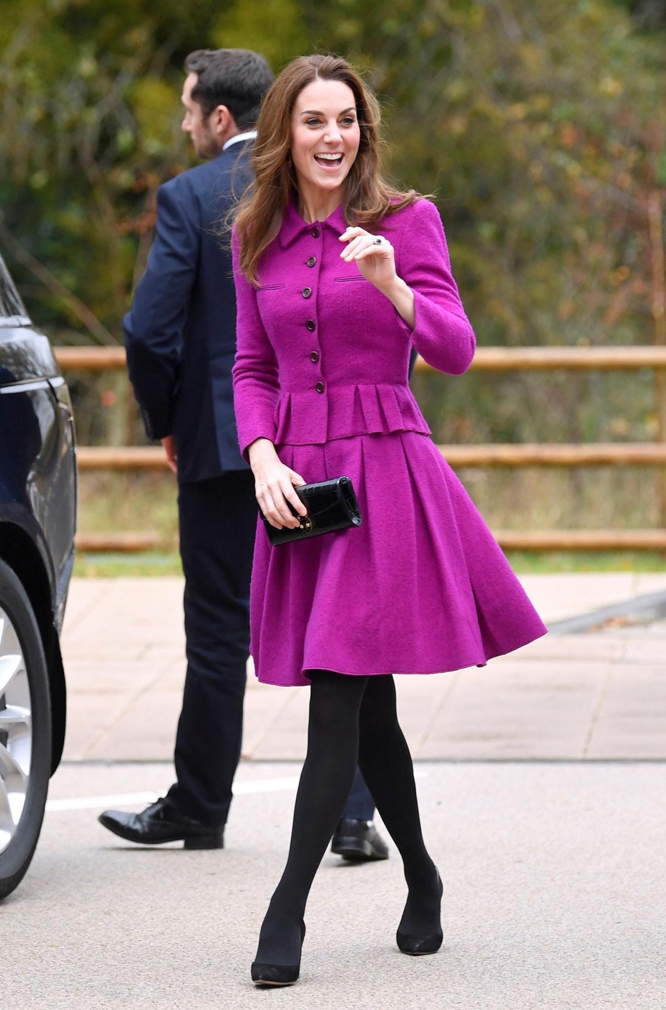 For the outing, the Duchess of Cambridge wore a magenta skirt suit by Oscar de la Renta, black suede Gianvito Rossi heels and an Aspinal of London clutch.
