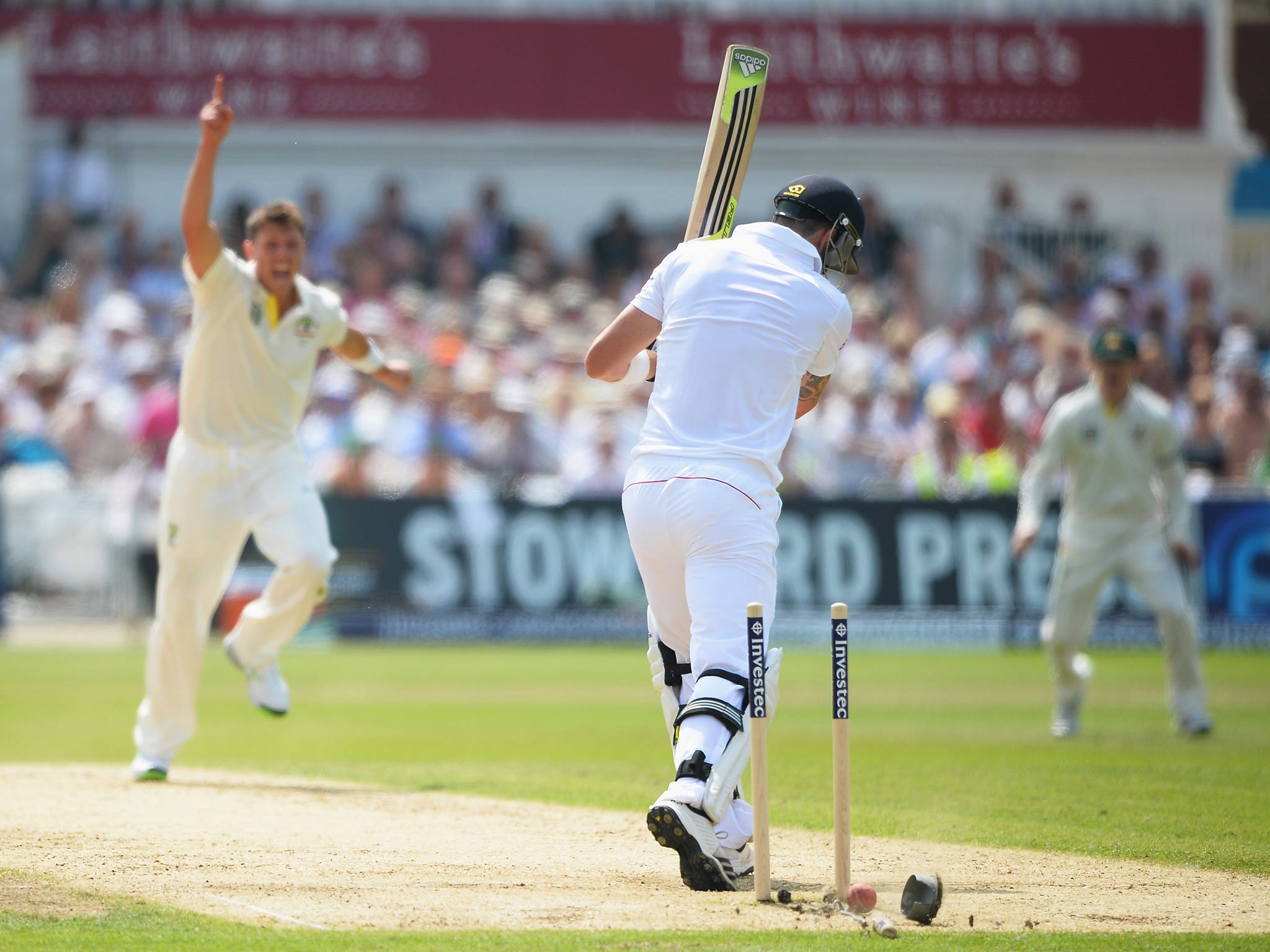 In the next over Haddin failed to pouch a difficult low chance to his right, offered by Bell swatting at Siddle, perhaps also affected by the dispute. It may be too early so suggest that the series was won and lost in this period. England had their own misfortune the previous day when Agar, on his way to 98, was ruled not out stumped on six when his foot seemed patently not to be over the line.