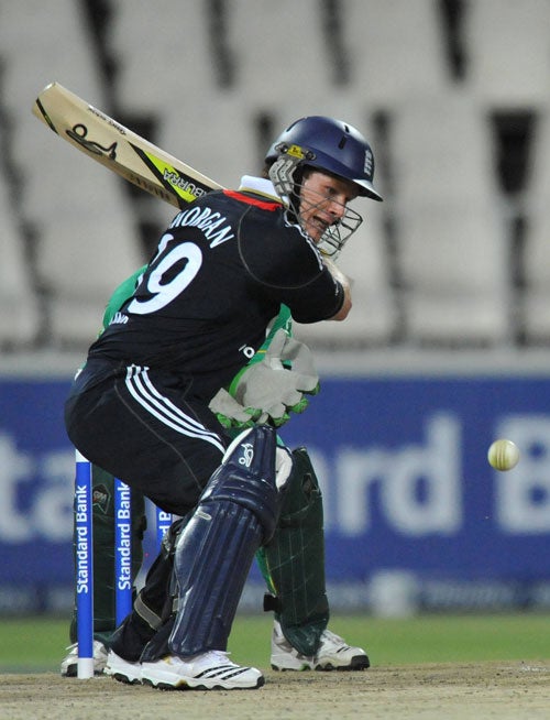 That this performance came only three days after England had made their lowest Twenty20 score of 89, against South Africa A, was perhaps typical. Their captain Paul Collingwood who shared a fourth-wicket partnership of 98 with in 55 balls with Morgan, said: "We know we have to be more consistent. But this was a completely different wicket, the ball came on to the bat and some of the shots Morgan played were exceptional. We knew on this ground that defending the total wouldn't be easy and with rain about it became a game within a game."