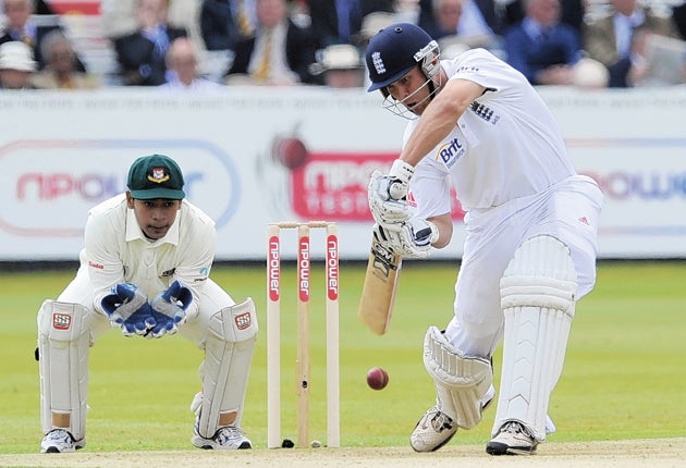 Bangladesh did not bowl as well as they should have done in these circumstances when constant accuracy and slight movement can induce mistakes. Too much of their bowling was harmless and wayward. None of their seamers looked properly worthy of Test status. Their only wicket in the morning session was that of Alastair Cook, out leg before to a ball from Shahadat Hossain which nipped back, was almost certainly too high and was almost identical to a ball that had hit him in the same spot in the previous over and elicited a not-out verdict.