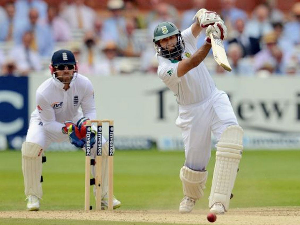 Amla went on to a serene hundred and it needed a peach of a delivery from Finn which pitched middle and hit off, going up the Lord's slope, to remove him for 121, made from 205 balls. Soon after De Villiers edged to Strauss at first slip, the captain's record 121st catch for England.