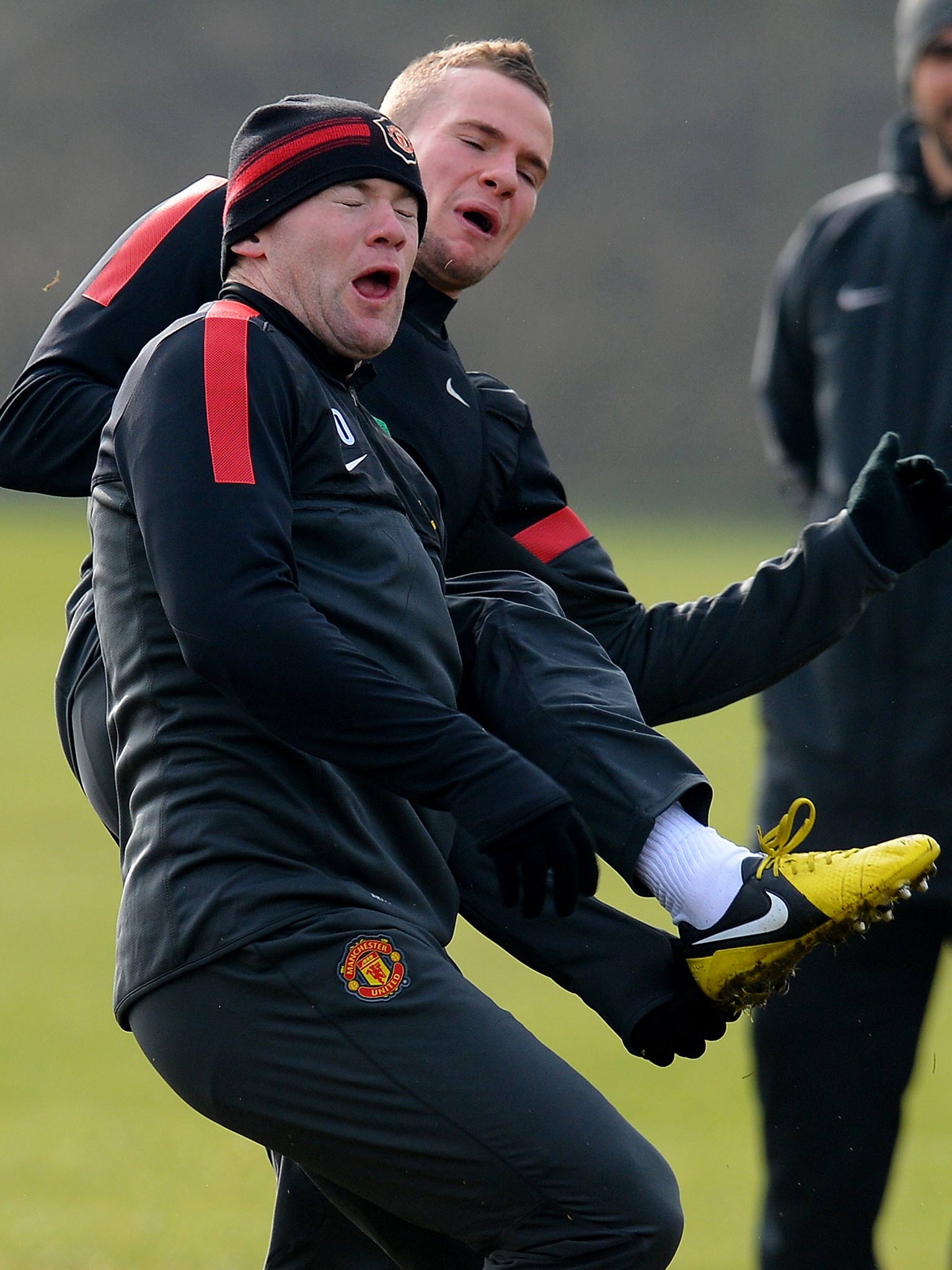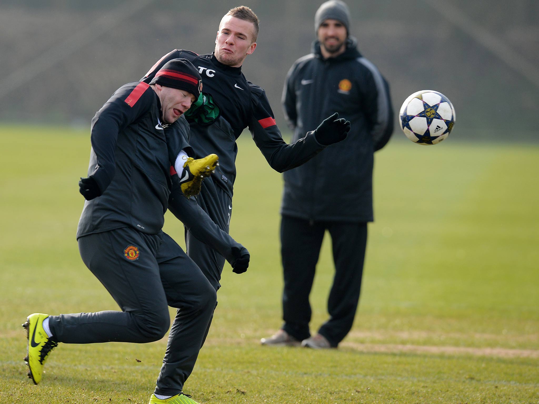 Rooney proved he was up for the battle today, as the pictures above show. The striker was caught in the face by team-mate Tom Cleverley as the squad prepared for tomorrow's last 16 Champions League encounter.