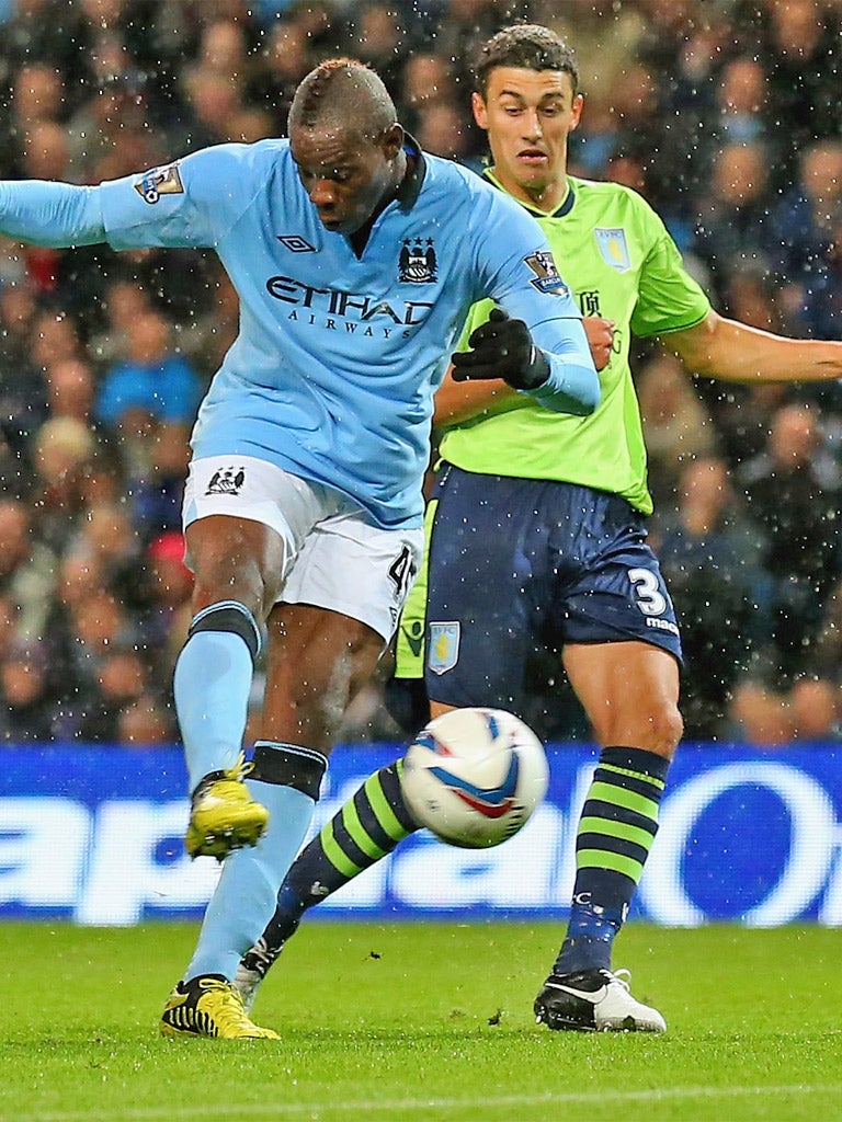 Balotelli scored with his first real chance. James Milner, like Barry facing a club that has declined considerably since he left it, controlled a long ball from Tevez. Cutting in from the right, he played it to Balotelli, who was standing unmarked between two defenders, whose lack of attention allowed him to control a ball that sprayed water whenever it hit the turf. He then emphatically beat Shay Given for his first goal since the night he had dazzled a continent by eliminating Germany in the semi-finals of the European Championship.