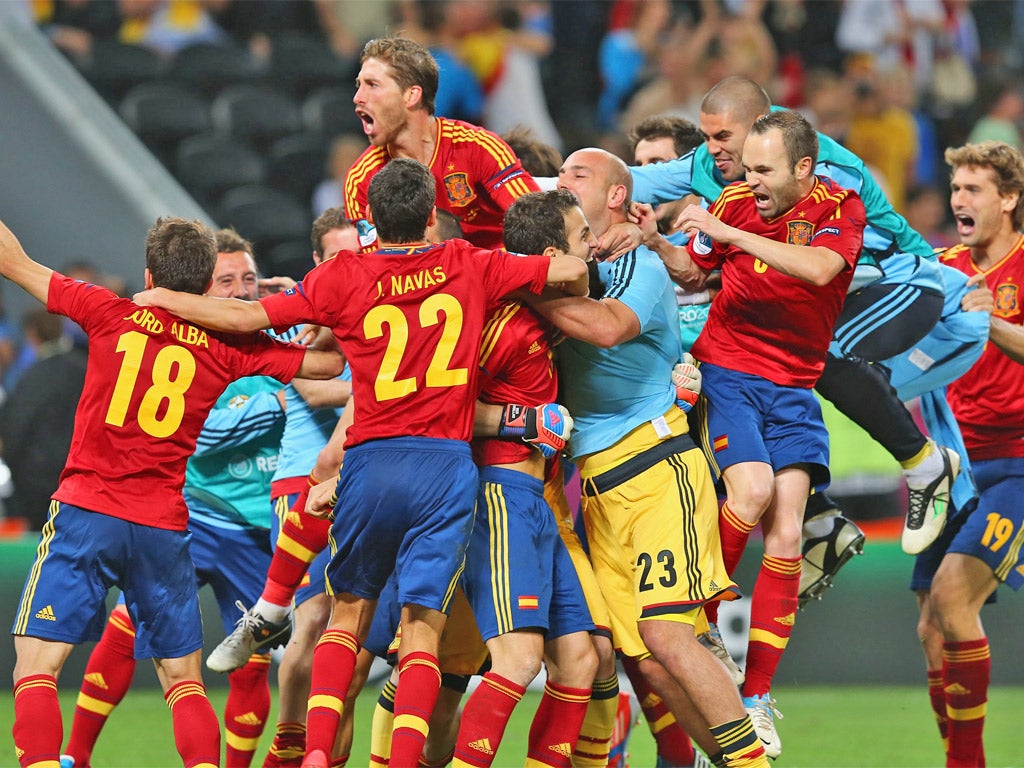 That was Portugal's chance. They never had another one and the suspicion was that if extra time had gone on 10 more minutes Spain would have won it without recourse to penalties. As against Italy in the quarter-final of Euro 2008 in Vienna, it fell to Fabregas to convert the decisive kick. That was the victory that turned Spain from also-rans into challengers; four years on, they stand on the brink of an unprecedented third straight major title.