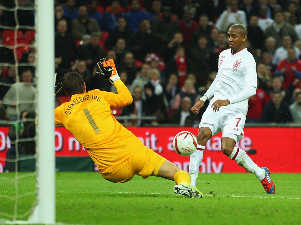 In the early stages, Adam Johnson, who began on the right side cutting in on his stronger left foot and later, after the withdrawal of Gerrard, from the left, was the brightest spark. On 26 minutes, the Manchester City winger doubled back twice on De Jong and Joris Mathijsen before he hit a shot that deflected wide off Johnny Heitinga.