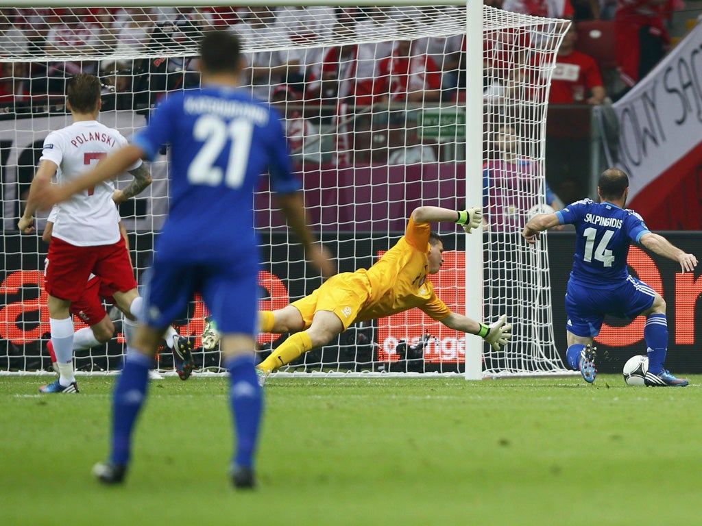 Poland's job now was simply to coax them out of a 4-4-1 formation. Or so it seemed. The joint hosts also had to be careful in defending their goal and this they failed to do only six minutes into the second half when Szczesny hurtled impetuously off his line in response to a near-post cross from Vassilis Torossidis and appeared to succeed only in distracting Marcin Wasilewski, the defender stumbling over the ball and falling so that, with Szczesny also prone, Salpingidis had little difficulty in prodding it into the net. Had there been a call that Wasilewski did not hear? Amid the din, it was possible. And the drama had only begun.