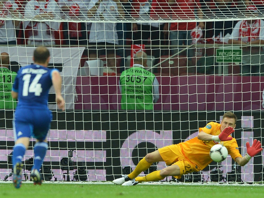 How's this for a first touch? Przemyslaw Tyton, the PSV Eindhoven goalkeeper, replaces the sent-off Wojciech Szczesny of Arsenal and immediately faces a penalty taken by Giorgos Karagounis, the captain of Greece. He dives to his left and saves. The roar almost takes the roof off Poland's new National Stadium.
