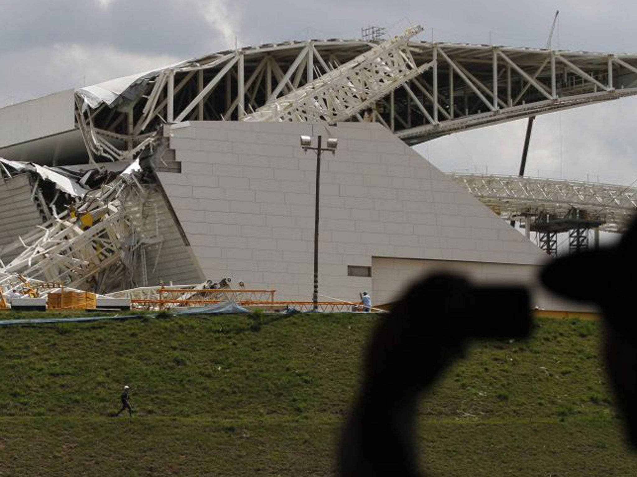 The crane – believed to be the biggest in Brazil – fell on to one stand of the £220m Arena Corinthians in Sao Paulo, leading part of it to collapse.