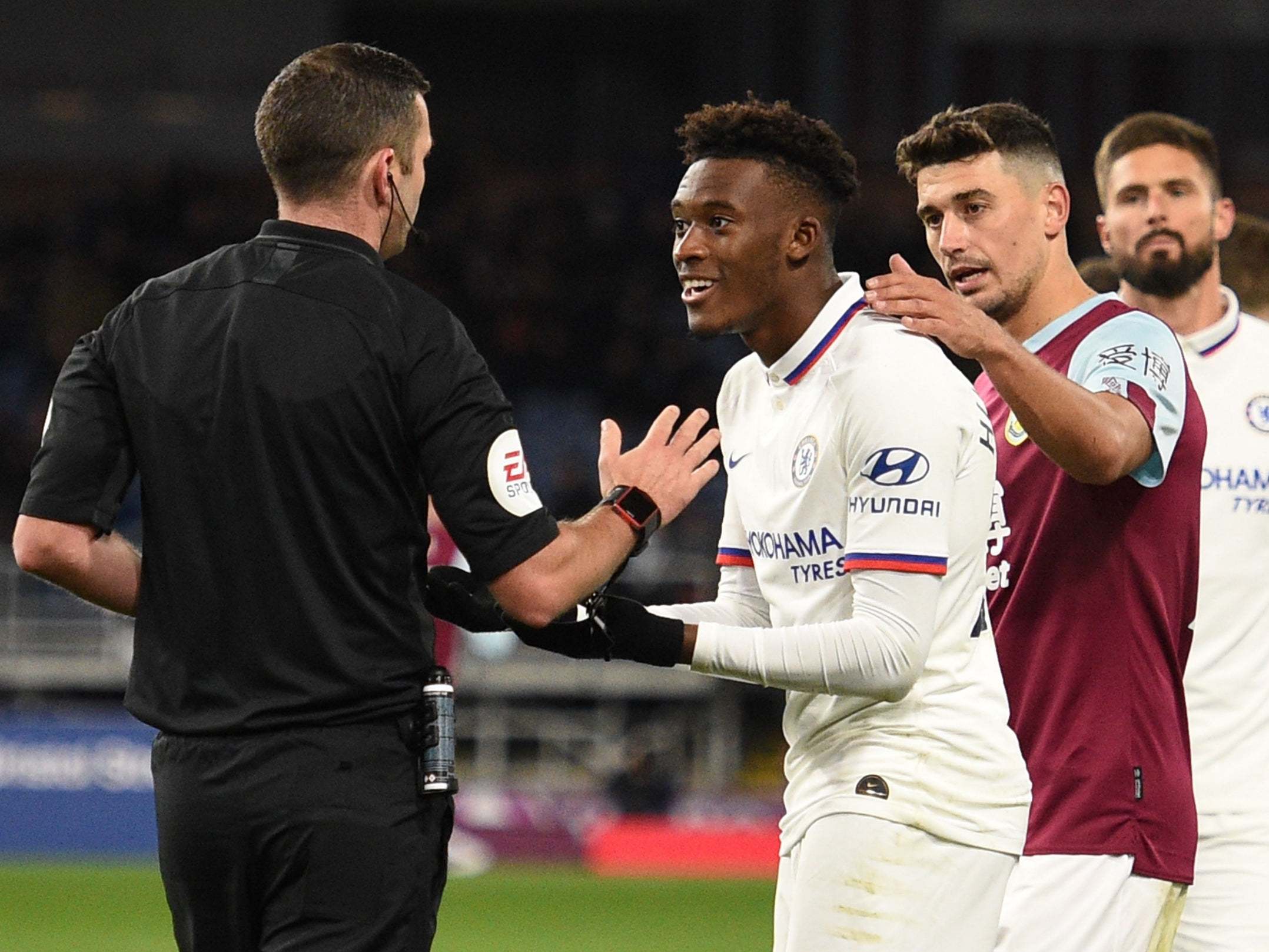 Blues forward Hudson-Odoi was initially awarded a penalty for going down in the box during the 4-2 win at Turf Moor, before being booked for simulation after the decision was overturned by VAR.