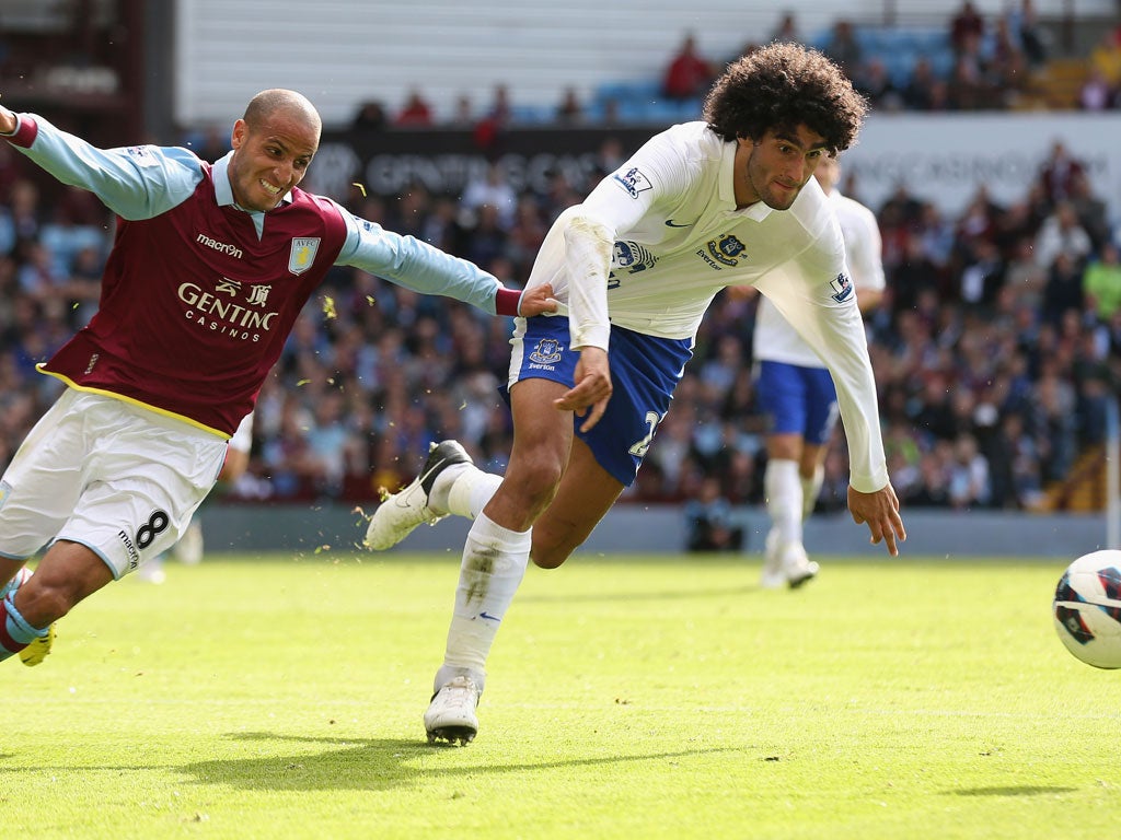 On the evidence of this game another hard season beckons as Everton outplayed an inexperienced home side who were flattered to have lost only 3-1. Steven Pienaar, Marouane Fellaini and Nikica Jelavic put the game beyond Villa before half-time as Everton built on last Monday's impressive opening victory over Manchester United. Villa, despite losing Ciaran Clark to a red card, pulled a goal back through Karim El Ahmadi but Lambert is still looking for his first point since leaving Norwich City for the Midlands.