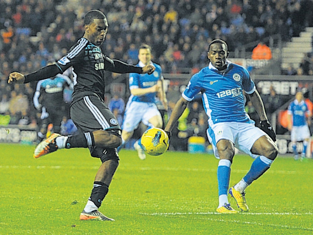 This time Wigan refused to submit and took control for the first time. Maynor Figueroa, culpable in not tracking Sturridge closely enough for the goal, hit a left-footed shot from 25 yards that Cech had to push round the post for his first save of the night and suddenly the defence were looking vulnerable. They survived one bizarre incident in which Rodallega was foiled by Cech, who was lying on the ground as Di Santo had a follow-up shot headed off the line by Ivanovic. And with two minutes left Cech failed wretchedly to hold a toe-poke from the left by Rodallega, Gomez tapping in for his fourth goal in five games.