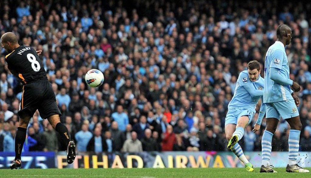 For all the high-priced African, Balkan and Latin footballing talent in Saturday's Manchester City team, it was a relatively low-budget Englishman who supplied the highlight of the 3-1 win that kept them five points clear at the top of the Premier League. With Wolverhampton Wanderers pressing for an equaliser against City's 10 men, Adam Johnson, signed from Middlesbrough in February 2010 for £7m – change down the back of a sofa by City standards – produced an almost nonchalant curling shot into the bottom corner from 30 yards.