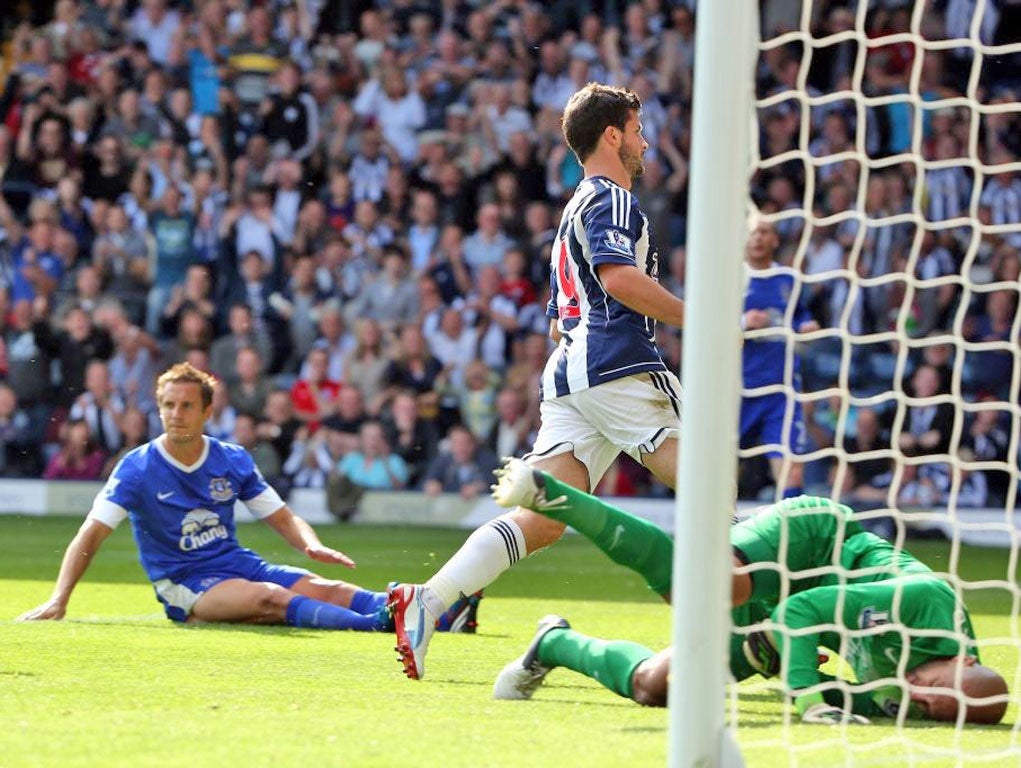 At the other end, Long should have scored in the 29th minute when he got in between his markers to meet Liam Ridgewell's cross but his header thumped the crossbar. Albion opened up Everton again on the stroke of half-time when Youssouf Mulumbu flicked the ball on for James Morrison to run through but the Everton keeper Tim Howard kept out his shot with a strong hand.