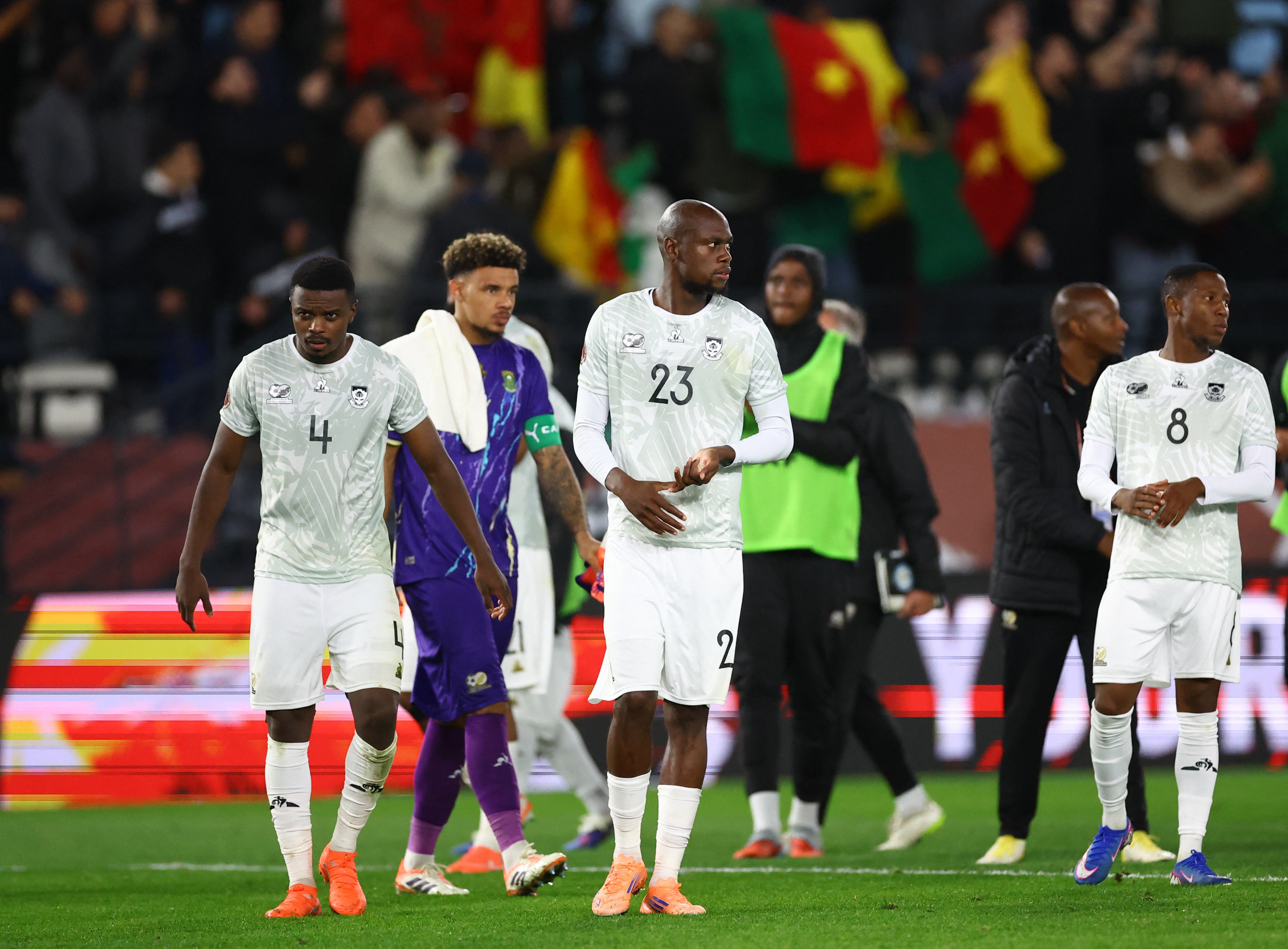South Africa continued to dominate for much of the first half but it was Cameroon who got the lucky break, with Danny Namaso’s shot deflected into the path of Tchamadeu, who fired in the opener on 35 minutes.