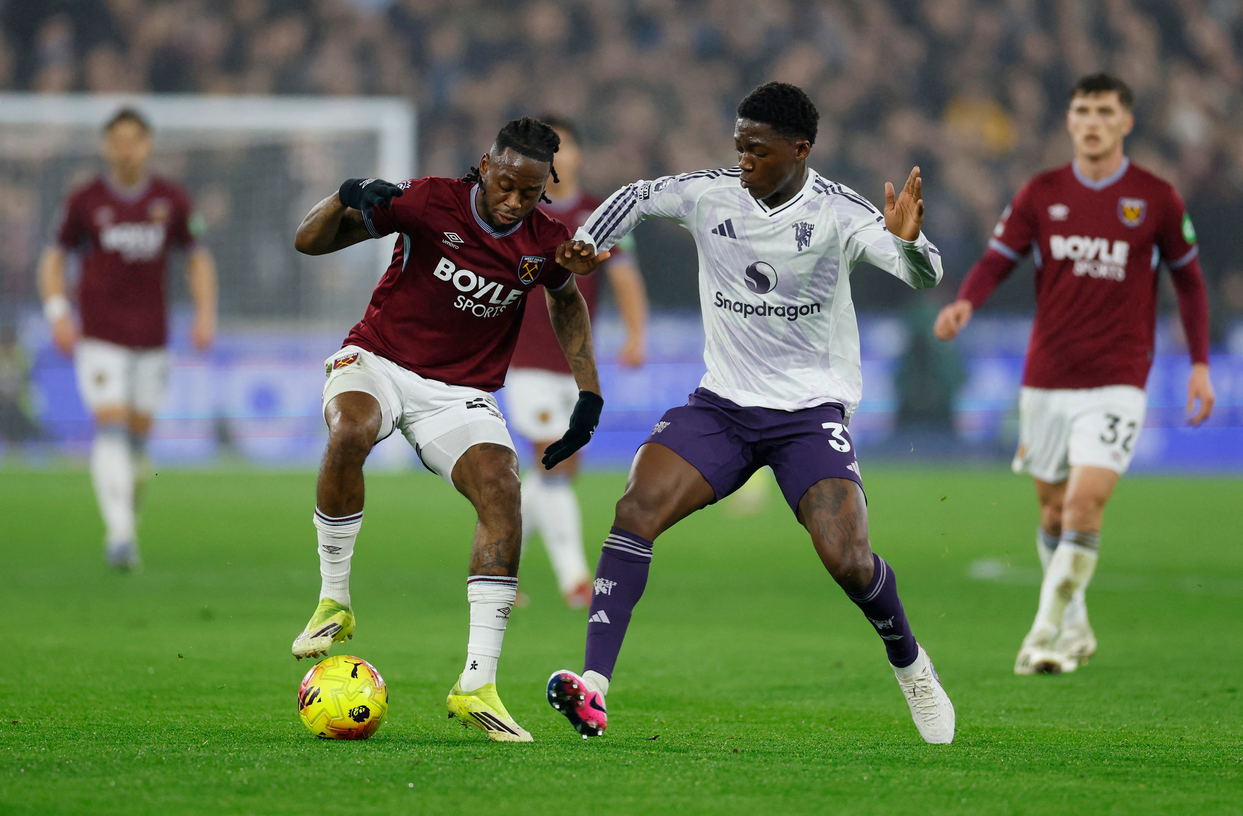 The visitors venture up the other end and Shaw slips it to Amad, but his effort from inside the box rattles against the side-netting.