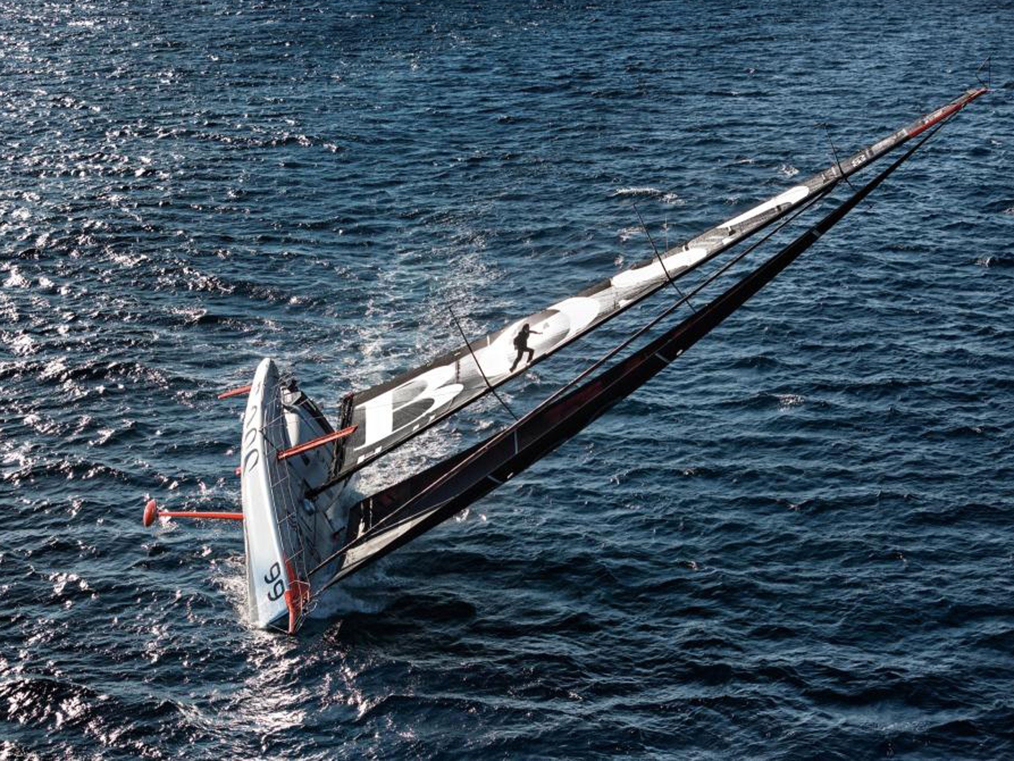 Alex Thomson ran the length of the 30ft mast of his HUGO BOSS yacht before jumping into the ocean