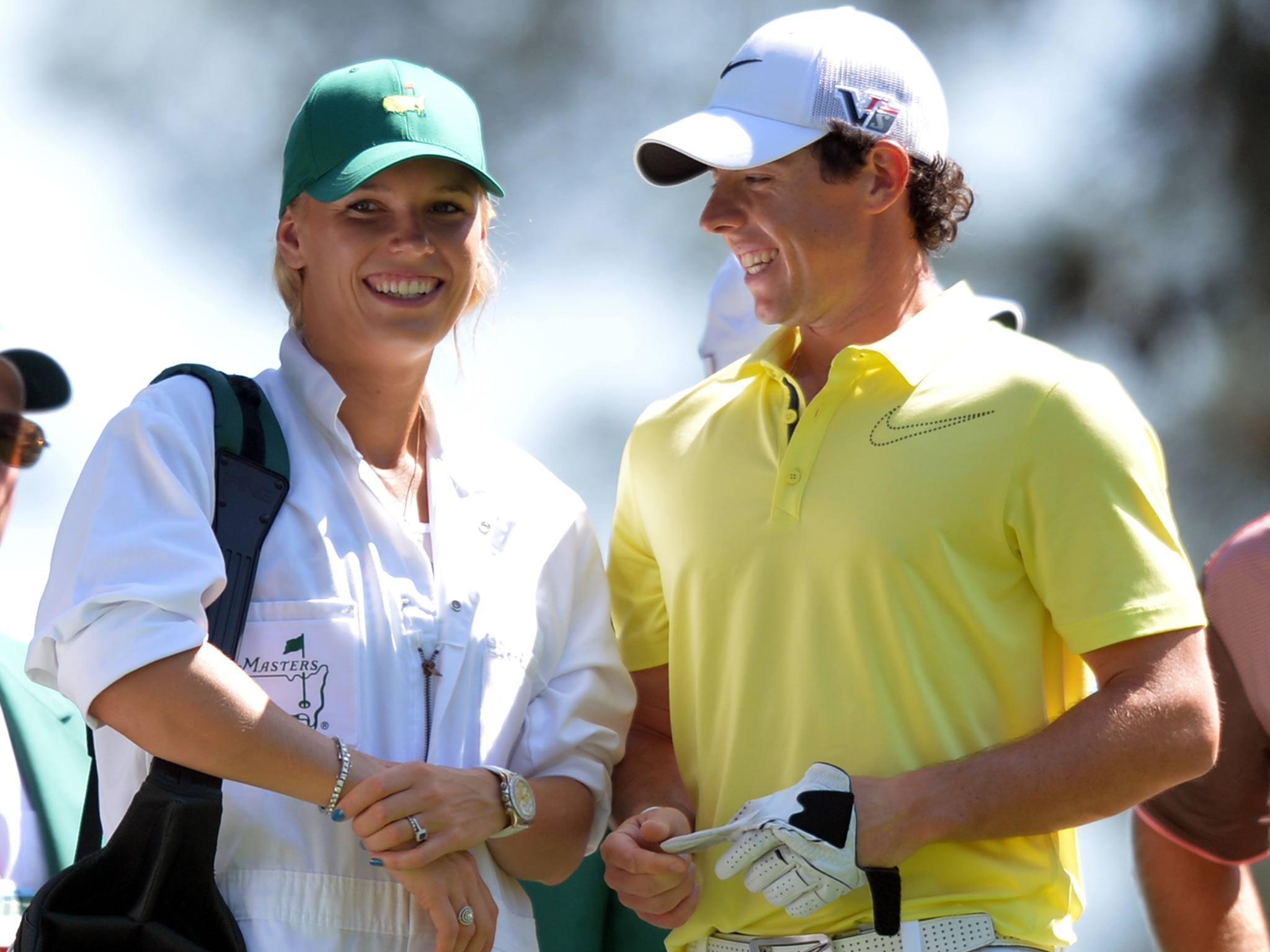 During the traditional par-three competition on the eve of the Masters, McIlroy's tennis star girlfriend Caroline Wozniacki carried his clubs around the course.