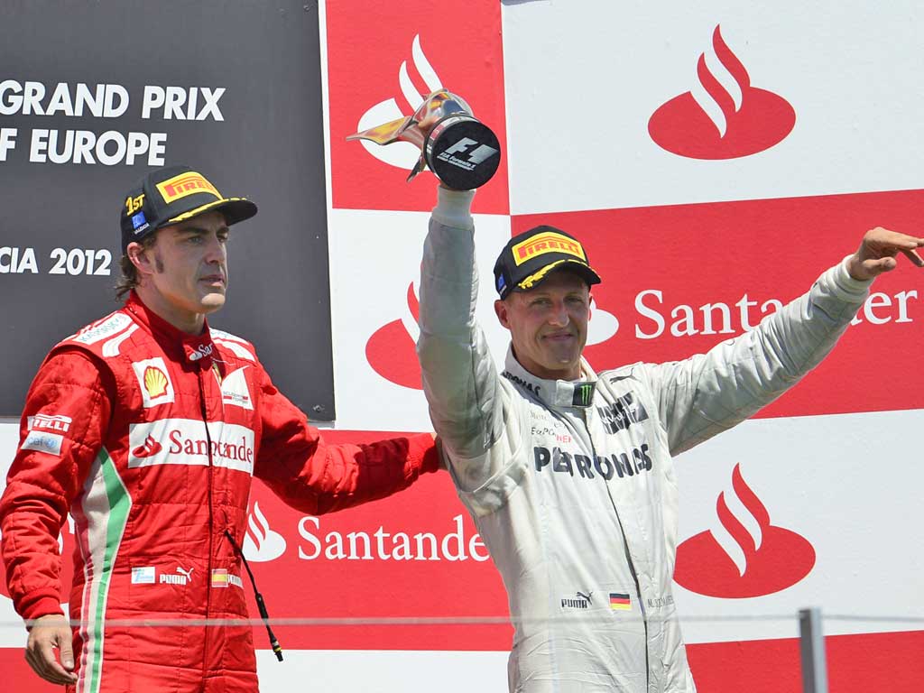 The incident between Hamilton and Maldonado set the scene for Michael Schumacher's return to the podium for the first time since his comeback to the sport. He and Red Bull's Mark Webber had made late tyres stops, on the 44th and 38th laps respectively, and running nose to tail they dispensed with Nico Rosberg, Jenson Button and Sergio Perez, then the Force Indias of Paul di Resta and Nico Hulkenberg, before the demise of Hamilton and Maldonado elevated them to third and fourth places respectively.