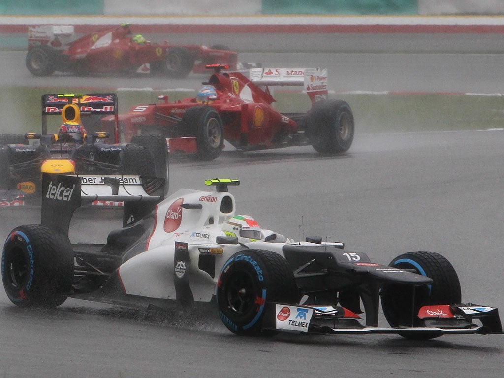 A downpour before the start created the drama that allowed Perez to challenge. Hamilton led his McLaren team-mate Jenson Button off the line and Lotus's Romain Grosjean spun himself into Michael Schumacher after bursting momentarily into third place. One team kept cool in the rain, Sauber astutely calling in Perez at the end of that eventful opening lap for full wet tyres instead of the intermediates on which everyone started. By the time the rest had followed suit – and the race had been suspended on lap nine for almost an hour as conditions worsened – Perez was up to third.