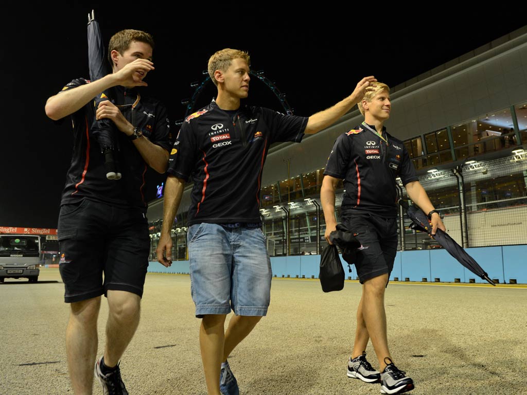 In the initial 90-minute run reigning champion Vettel edged McLaren's Lewis Hamilton by just 0.049 seconds around the five kilometres of the Marina Bay Street Circuit.
