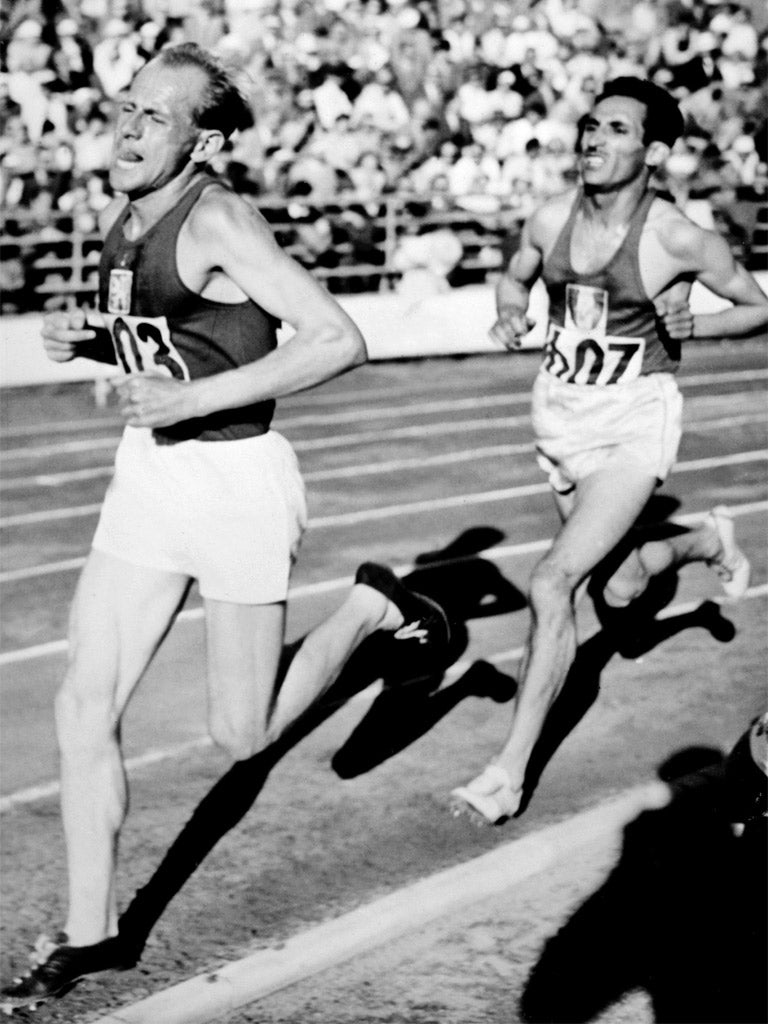 Winner of the 10,000m gold at the London Olympics in 1948, Zatopek successfully defended that title in the Finnish capital, then won the 5,000m and made a last-minute decision to compete in the marathon – the first of his life. After 10 miles, he turned to Jim Peters, the world record-holder and favourite, and asked: "Is this pace too fast?" Peters, an optician from Essex, replied: "No, it's too slow."